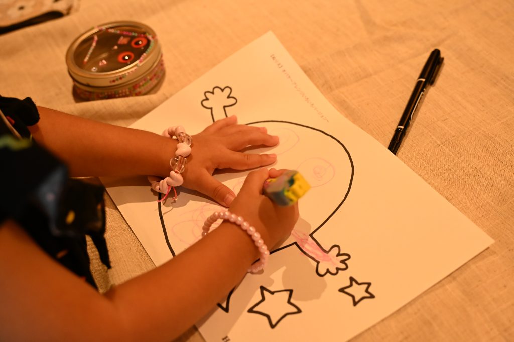 子供達が作成するクレヨンを笑みを浮かべて眺める漆橋店長