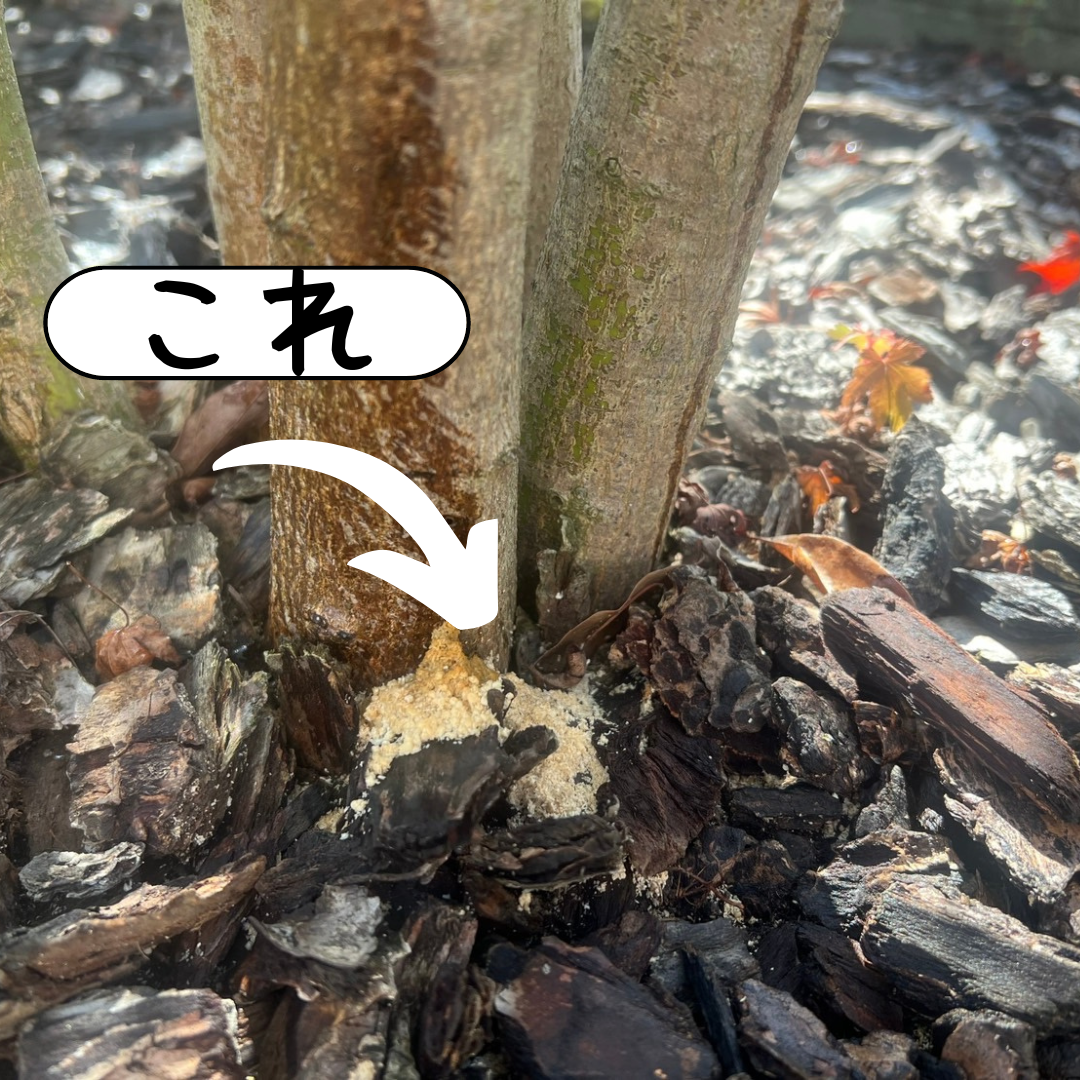 これは「テッポウ虫」が幹の中から排出した「おがくず」です。
